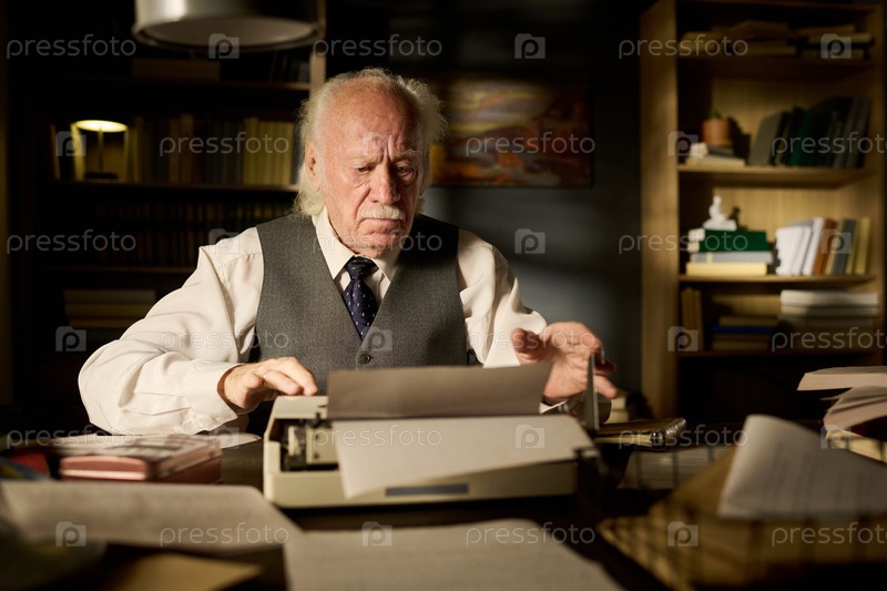 Старший мужчина печатает на пишущей машине, работая в офисе по ночам