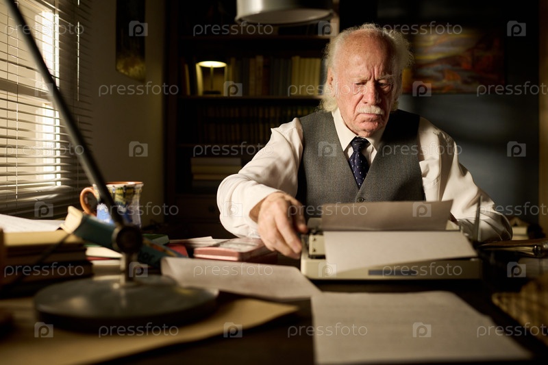 Мужчина, работающий за столом с помощью пишущей машины в офисной обстановке