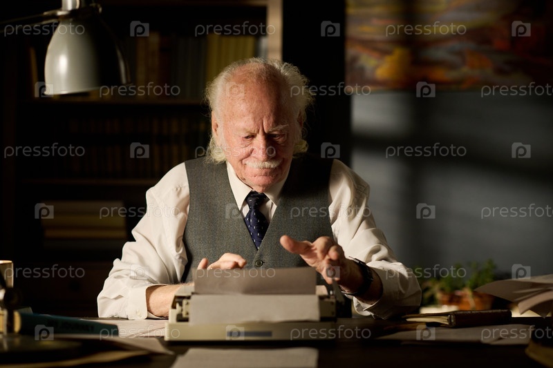 Мужчина, печатающий на пишущей машине в старинной офисной обстановке Senior