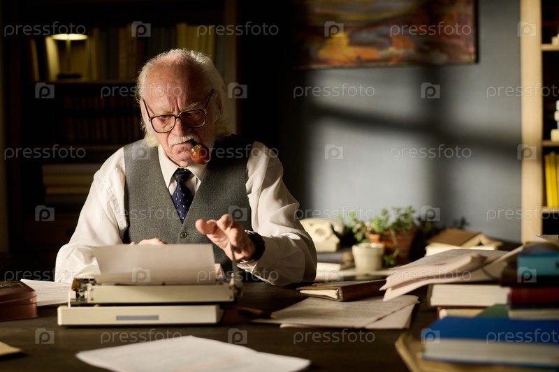 Старший мужчина пишет на печатной машинке в офисе, окруженный документами