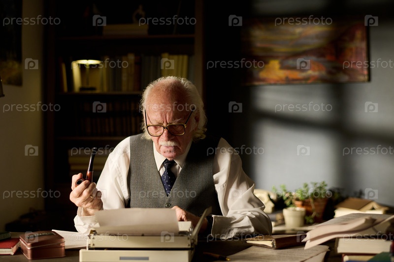 Старший мужчина пишет на печатной машинке, держа трубу в помещении