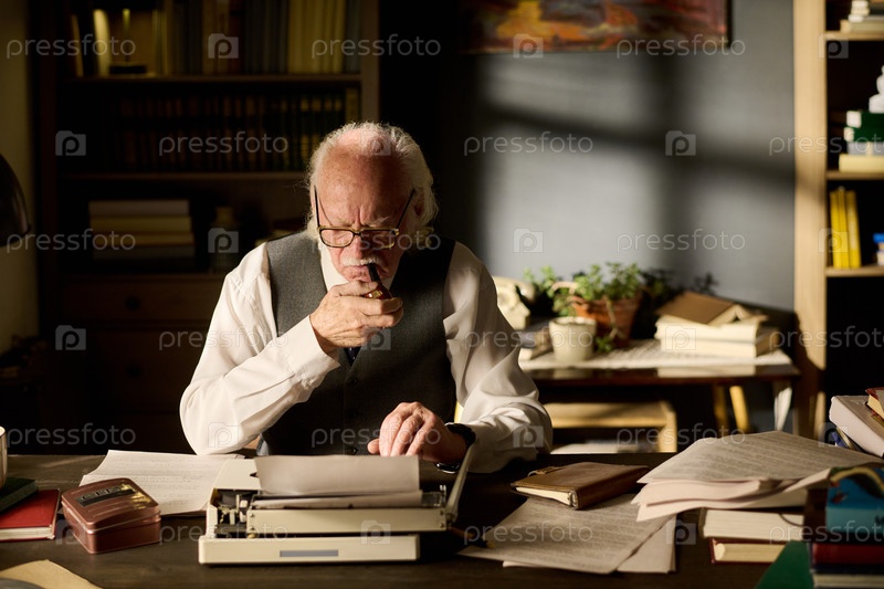 Старший мужчина просматривает рукопись, куря трубу на столе в помещении
