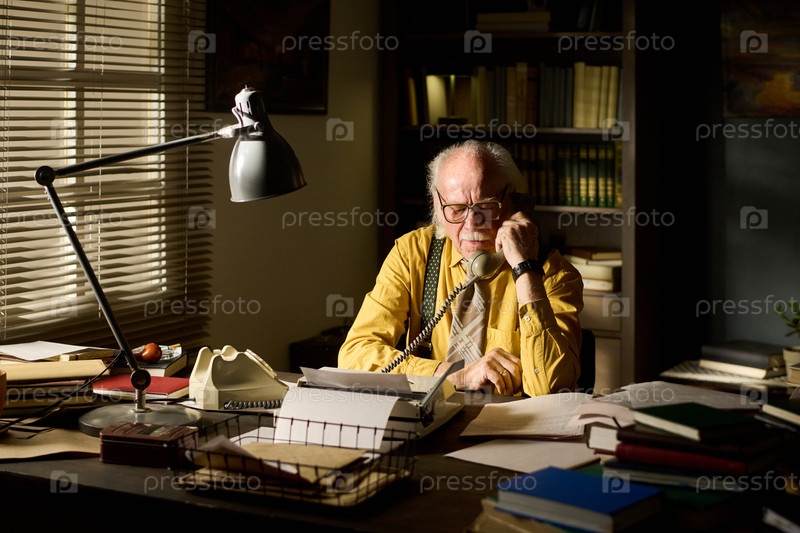 Мужчина сидит за рабочим столом и разговаривает по стационарному телефону в офисе Senior