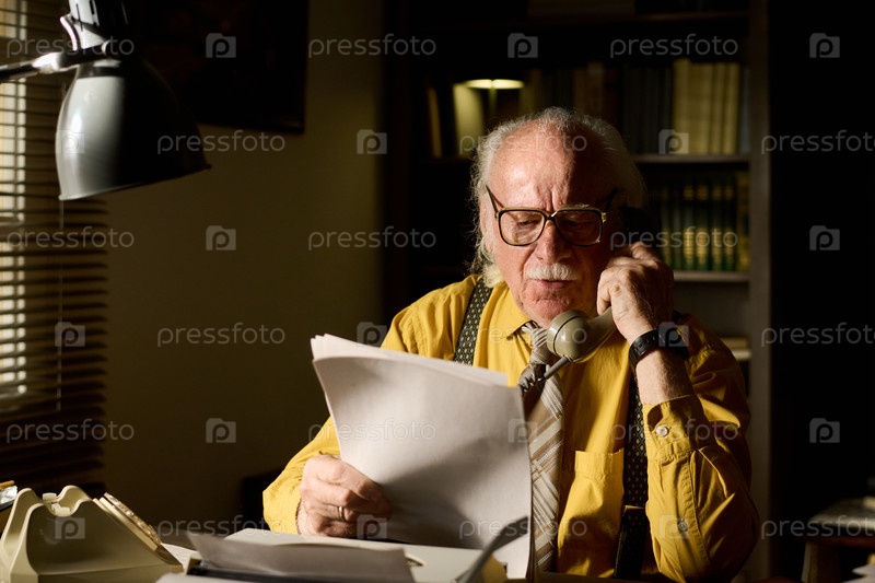 Старший мужчина разговаривает по стационарному телефону, читая документы