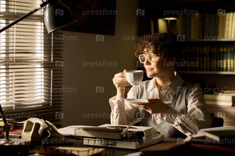 Женщина среднего возраста сидит за рабочим столом, пьет кофе в офисе