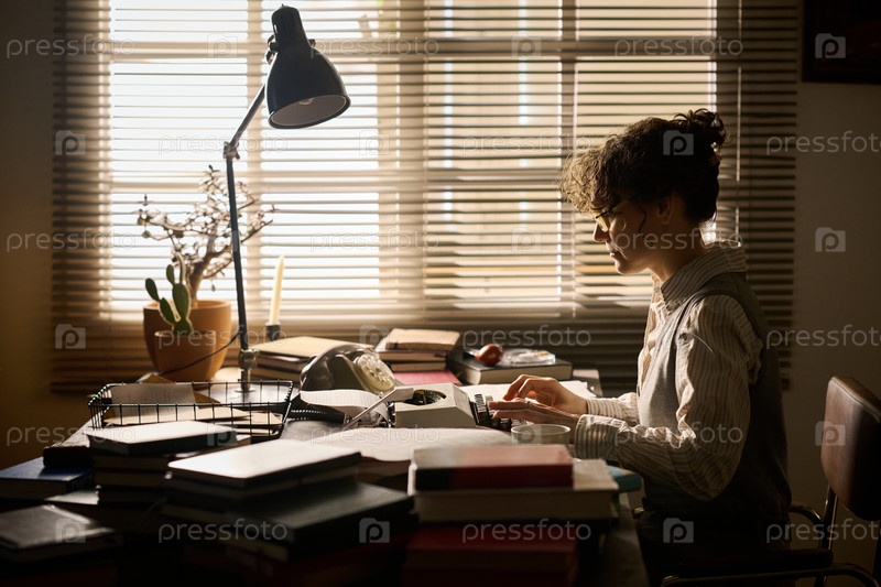 Молодая взрослая женщина печатает на старинной пишущей машине в домашнем офисе