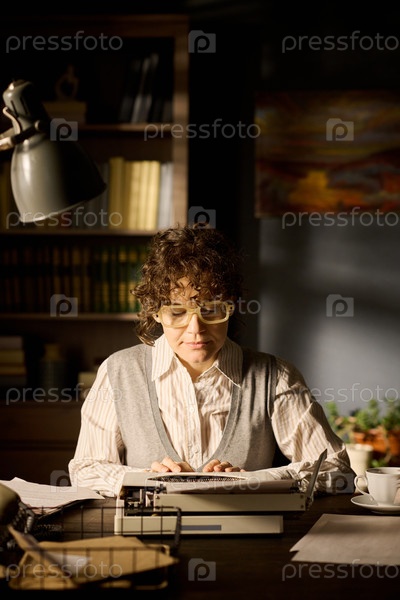Портрет молодой взрослой женщины, печатающей на пишущей машине в помещении