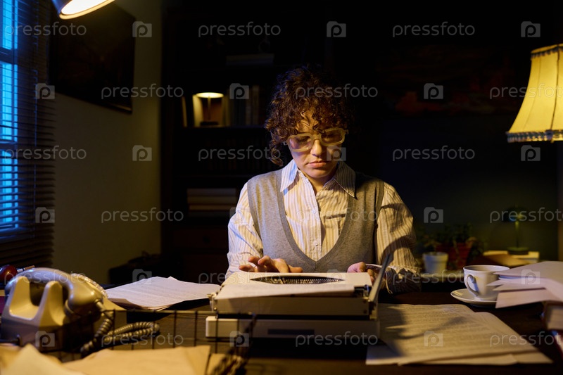 Портрет молодой взрослой женщины, печатающей на пишущей машине за рабочим столом