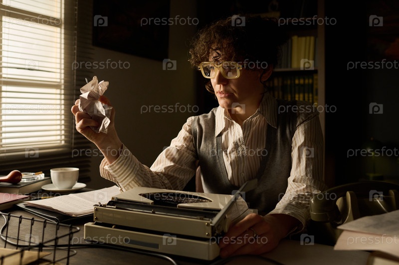Женщина среднего возраста сидит за рабочим столом, скручивая бумагу от разочарования