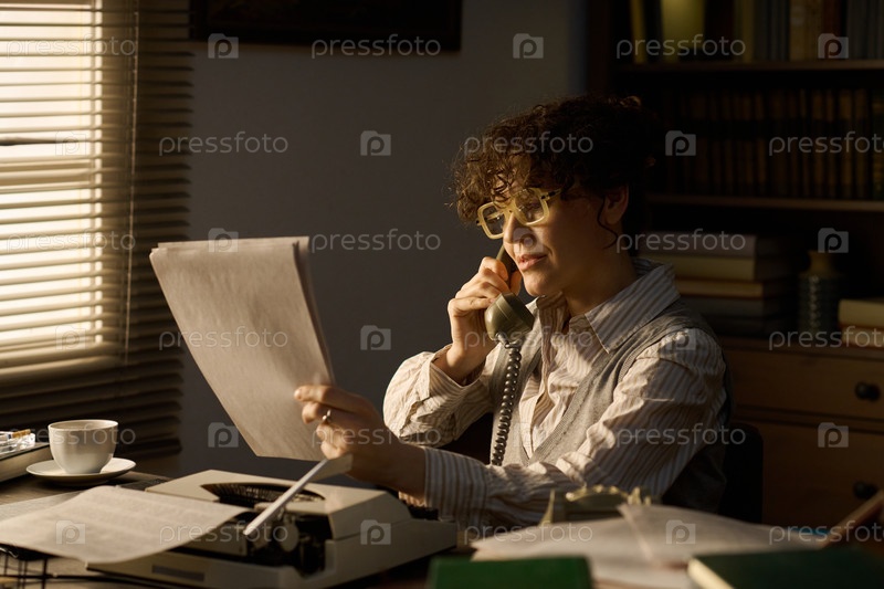 Женщина среднего возраста разговаривает по телефону, читая документы в помещении