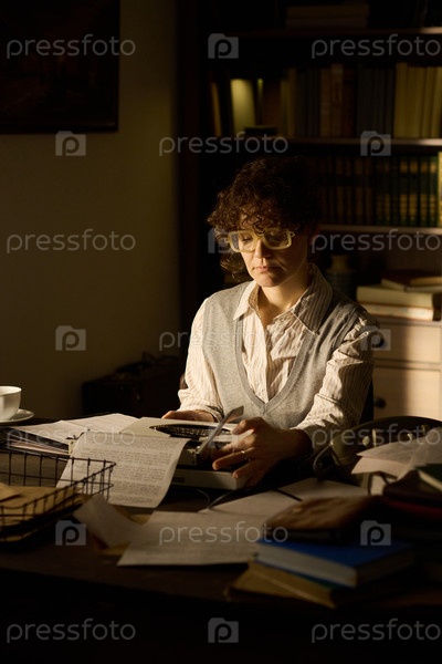 Молодая взрослая женщина, рассчитывающая финансы за столом в офисной обстановке