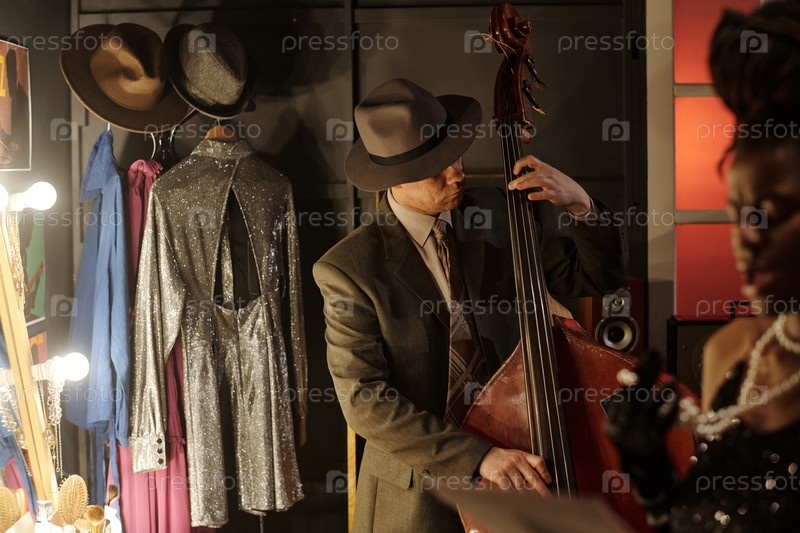 Мужчина среднего возраста играет на двойном басе во время джазового представления За кулисами