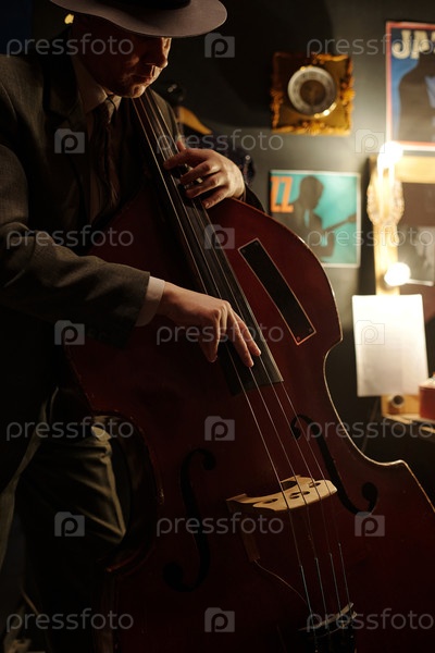 Мужчина средних лет играет на двойном басе в условиях джазового клуба