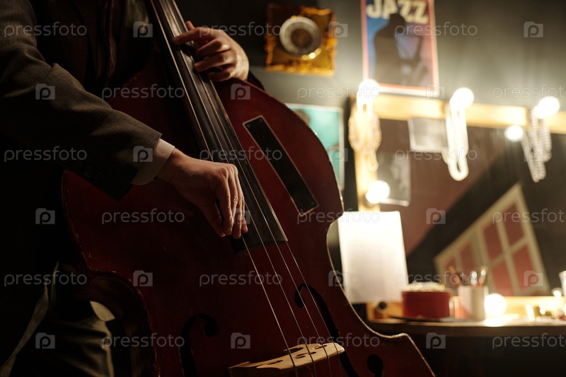Мужчина среднего возраста играет на двойном басе в раздевалке джазового музыканта