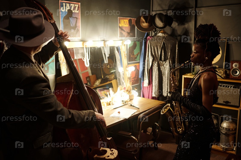 Мужчина среднего возраста и молодая чернокожая женщина исполняют джазовую музыку вместе