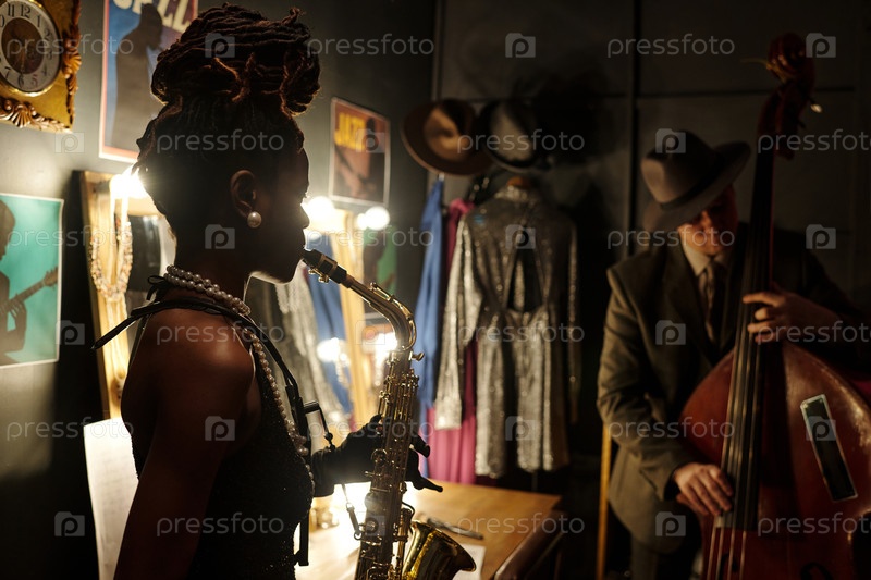 Молодая черная женщина практикует саксофон, в то время как мужчина настраивает двойной бас