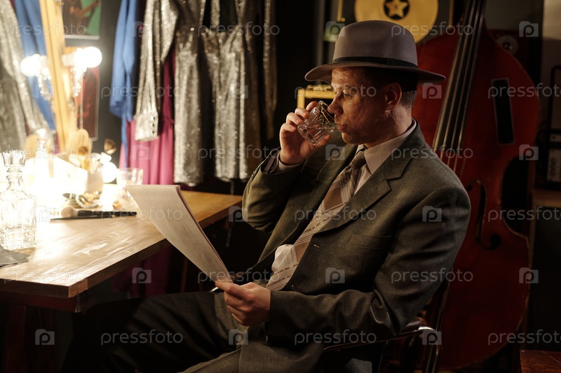 Мужчина среднего возраста читает пластиковую музыку, пья за кулисами