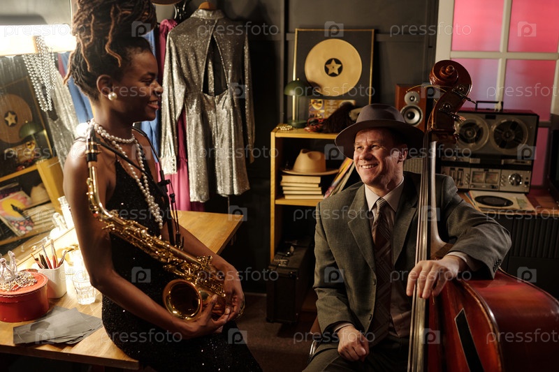 Молодая черная женщина держит саксофон и мужчина среднего возраста играет на басе