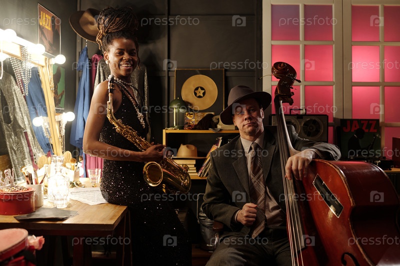 Молодая черная женщина и мужчина среднего возраста исполняют джазовую музыку вместе