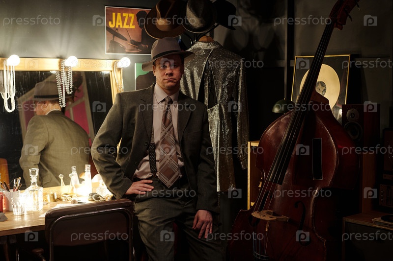 Мужчина среднего возраста в костюме позирует за кулисами с двойным басом
