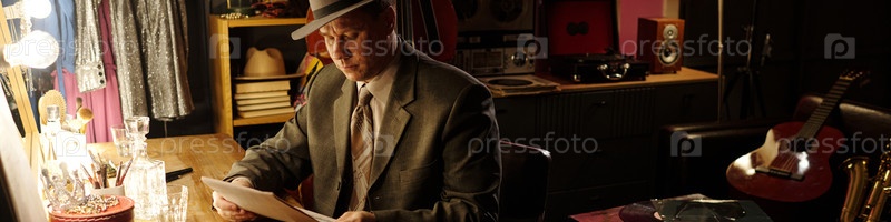 Мужчина среднего возраста читает листовую музыку в джазовом гардеробе