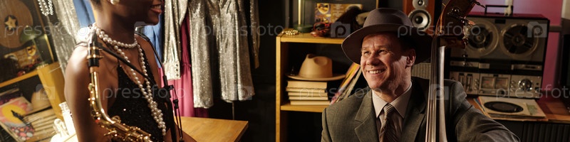 Мужчина средних лет улыбается, играя на двойном басе для молодой чернокожей женщины
