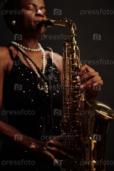 Молодая чернокожая женщина исполняет экспрессивный саксофон джазовое соло на сцене