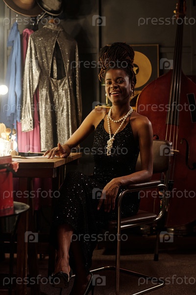 Молодая взрослая чернокожая женщина улыбается, сидя в раздевалке джазового музыканта