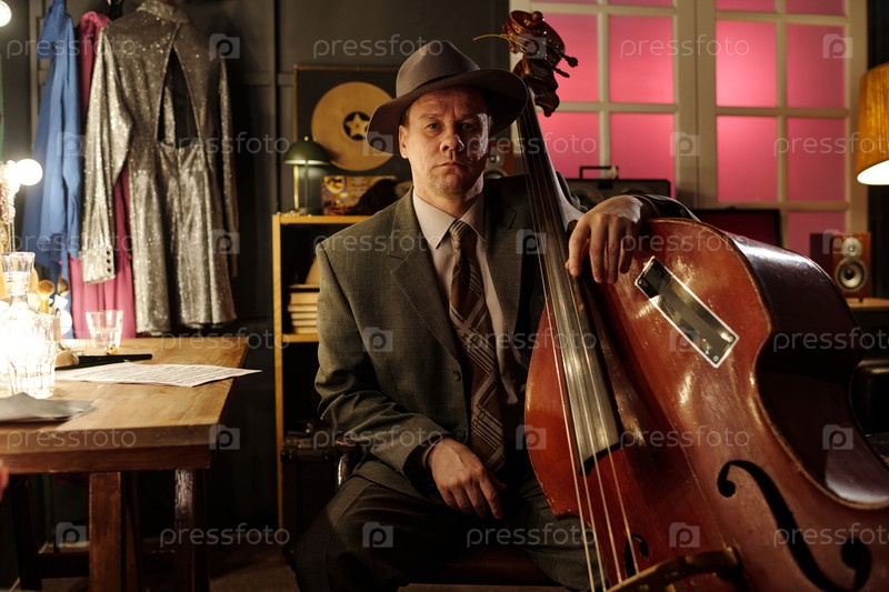 Мужчина среднего возраста, носящий шляпу и играющий на двойном басе в джазовом клубе