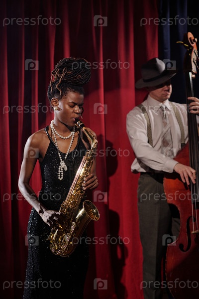 Молодая взрослая черная женщина играет на саксофоне с мужчиной, исполняющим бас