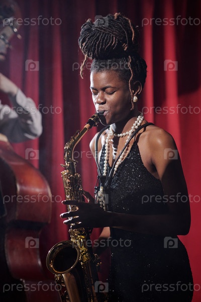 Молодая женщина-музыкант играет на саксофоне на сцене во время джазового представления