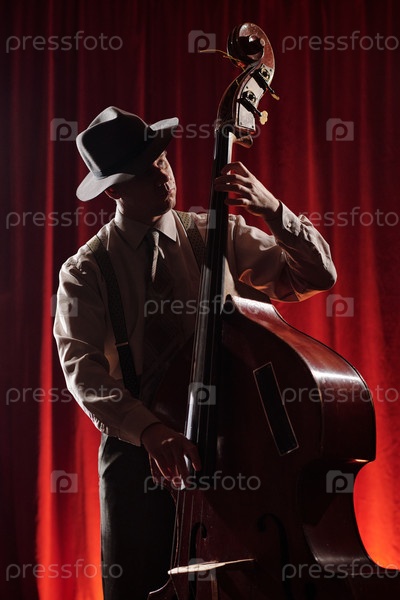 Мужчина играет на двойном басе на сцене во время джазового выступления