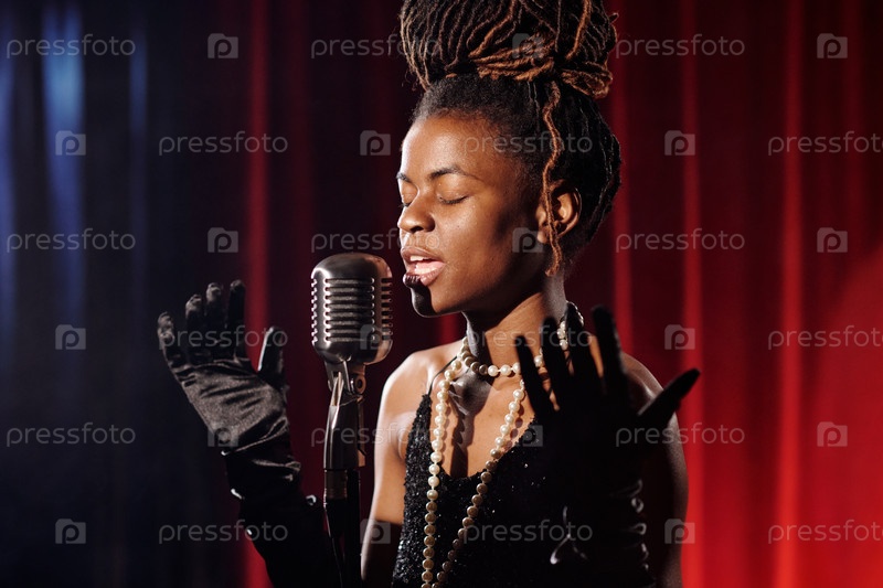 Черная женщина поет джаз на сцене со закрытыми глазами