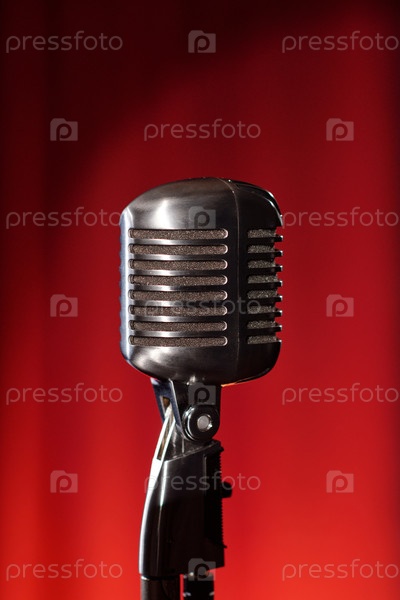 Винтажный микрофон, стоящий на красном фоне в условиях джазовых выступлений