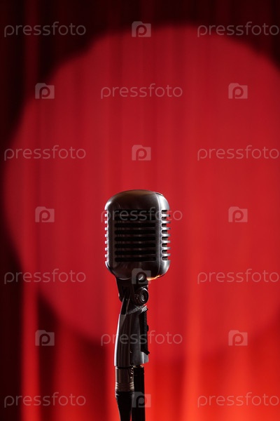 Ретро-микрофон, стоящий один в центре внимания и ожидающий прибытия джазового вокалиста