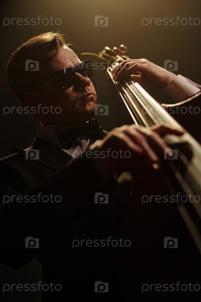 Мужчина среднего возраста играет на двойном басе во время джазового представления на сцене