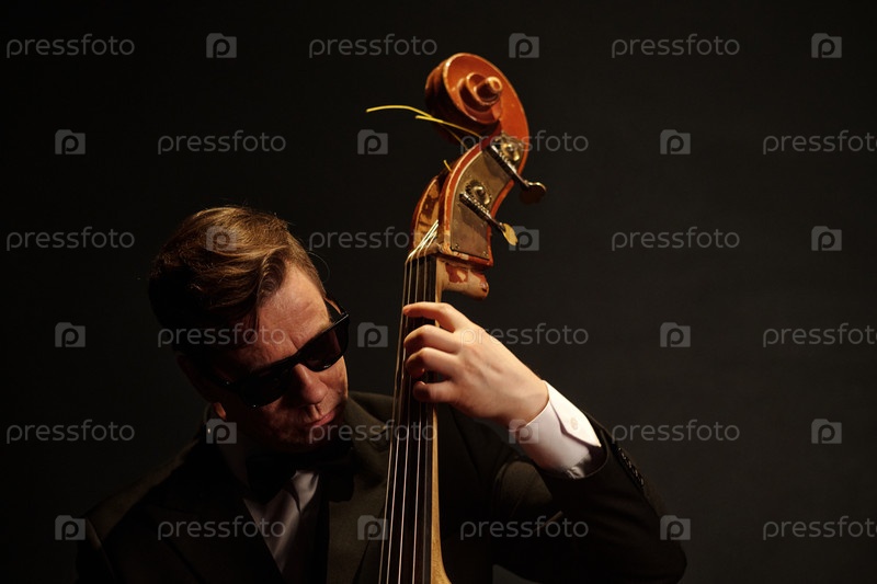 Молодой взрослый мужчина играет на двойном басе во время джазового представления на сцене