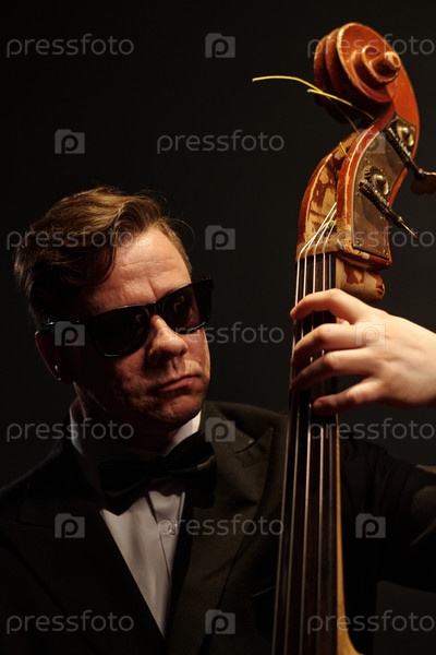 Мужчина среднего возраста играет на двойном басе во время джазового представления