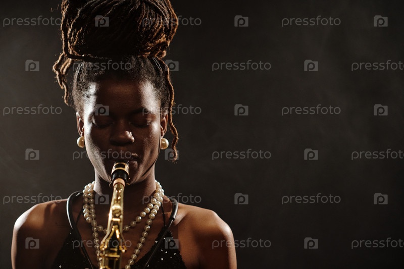Юная чернокожая женщина играет на саксофоне во время джазового представления на сцене