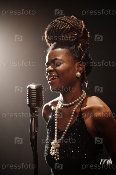 Молодая чернокожая женщина поет джазовую музыку в микрофон под световым освещением