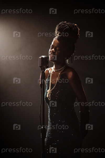 Молодая женская вокалистка поет джазовую музыку на сцене с винтажным микрофоном