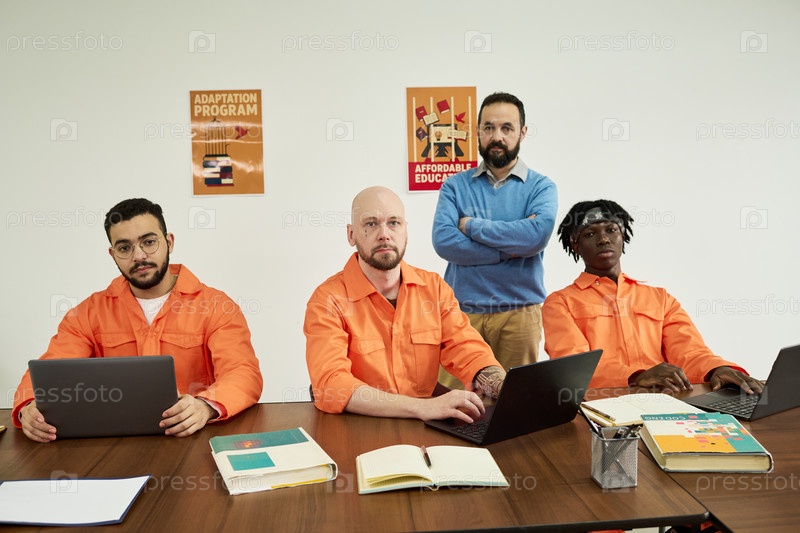 Мультиэтнические молодые взрослые мужчины используют ноутбуки, пока учитель контролирует занятия в классе