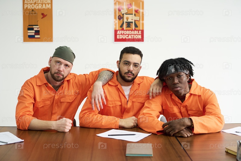 Мультиэтнические молодые взрослые мужчины, сидящие вместе в тюремном классе