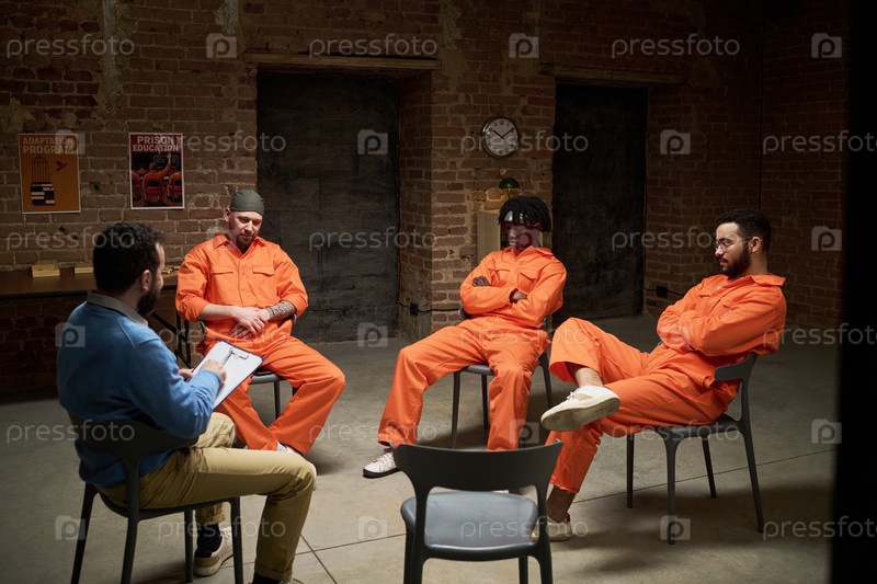 Мультиэтнические молодые взрослые мужчины, сидящие на групповой терапии в тюрьме