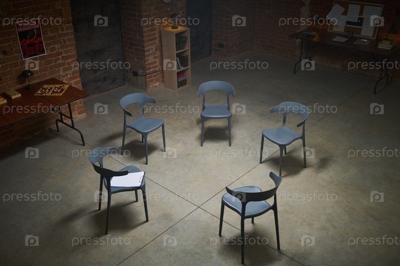 Пустые стулья расположены по кругу, предлагая групповую терапию