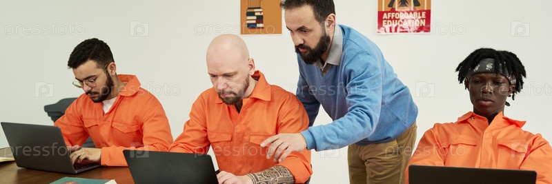 Инструктор среднего возраста помогает многонациональным заключенным с помощью ноутбуков