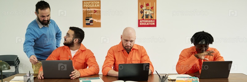 Мужчины разных этнических групп работают на ноутбуках в классной обстановке