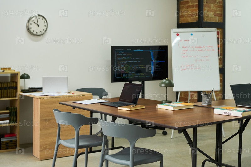 Пустой класс с ноутбуками и книгами, готовящийся к тюремной образовательной программе