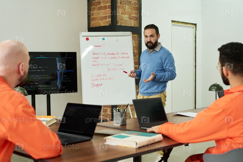 Мужчина средних лет преподает программирование заключенным