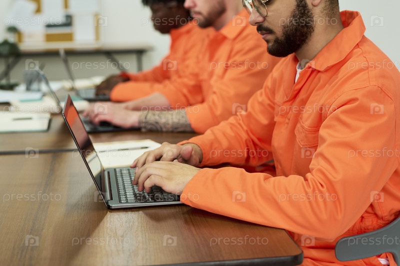 Группа молодых взрослых мужчин в тюремной форме, изучающих на ноутбуках в классе
